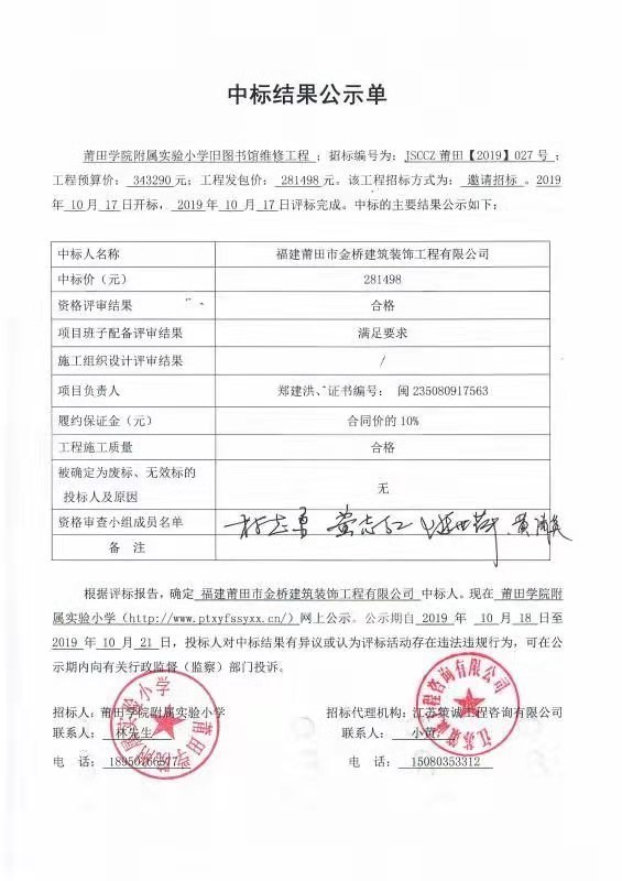 莆田学院附属实验小学旧图书馆维修工程 ;招标编号为:JSCCZ莆田【2019】027号 ;工程预算价: 343290元;工程发包价: 281498元。该工程招标方式为: 邀请招标 。2019年 10月 17日开标, 2019年 10 月 17日评标完成。中标的主要结果公示如下: