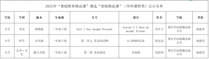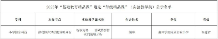 英语《Lesson3 I have an animal friend.》 教师简介:刘雪玉,中共党员,一级教师,执教课例曾获评“一师一优课,一课一名师”部级优课、福建省优质课比赛二等奖、莆田市优质课比赛一等奖、“绿联科技杯”莆田市中小学教师“教学评”实践能力比赛一等奖,莆田市校本作业设计比赛二等奖,并积极承担多节市级公开课,多次指导学生参加市、县级英语演讲比赛、配音比赛获奖。 课程介绍:本节课选自闽教版英语新教材三年级下册第一单元《Unit 1 Our Animal Friends》第三课时《Lesson 3 I have an animal friend.》 。本课设计以新课标理念为指引,着眼于发展学生的英语核心素养,延续前两课“参观动物园”情境,创设了“动物园研学成果分享”情境,提出本课大任务——“制作动物谜语大全”,让学生在有趣的任务情境中梳理语篇信息,模仿创编自己的动物谜语并与同伴交流运用所学语言,在语言学习的同时围绕“人与动物和谐共处”的主题,通过探讨动物对人类的情感、艺术、文化等方面积极影响,进而反思我们应该如何成为动物们的朋友。 科学《动物的耳朵》 教师简介:黄晶晶,一级教师。曾获2023年莆田市第六届中小学教师教学大赛小学科学组二等奖,2025年莆田市中小学教师“教学评”比赛三等奖,科学学科作业设计获评2025年莆田市义务教育阶段优秀作业设计,指导学生获得莆田市第七届中小学“科学月”系列活动科普我来说一等奖。 课程简介:以生为本,探趣求真。本课以“动物耳朵探秘之旅”为主线,紧扣一年级学生认知特点,打造闯关式探究课堂,通过猜耳朵、观察对比、模拟实验等趣味活动,让学生全程自主观察、大胆猜想、动手验证,亲历科学探究全过程。课程层层递进解锁动物耳朵的生存智慧,渗透科学实验方法,在趣味探究中培养学生的科学素养与探究能力,让科学课堂充满趣味与温度,尽显新课标下科学教学的育人魅力。 教师简介:郑晨昀,二级教师。曾获2023年福建省义务教育阶段优秀作业设计、2024年莆田市优秀作业设计,课例《卓玛》获莆田市“基础教育精品课”市级优秀;课例《狮王》获2025年莆田市师生信息素养提升实践活动(基础教育教师部分)一等奖。 课程介绍:本课为湘艺版一年级上册“艺术·唱游·音乐”内容。结合低龄学生的认知特点,以“节奏感知+文化浸润”为主线,设计节奏训练、童谣诵读、秧歌律动、创意表演等趣味活动;以唱游实践突破节奏难点,融入学生创意表现素材;让学生在童谣鼓韵中感受传统节庆文化与音乐魅力,领略山东秧歌民俗特色,培养民族文化认同感。 信息科技《游戏博弈算法的策略分析》 教师简介:颜琳,中共党员,二级教师,曾获得莆田市“威诺数控杯”青年教师教学基本功比赛三等奖、莆田市中小学教师“教学评”实践能力比赛三等奖等,原创作业设计获2024年福建省义务教育阶段优秀作业设计,执教课例曾获福建省思政课百堂示范课、2020年福建省“一师一优课”省级优课推广课等。 课程简介:本节实验课以“智能方格”益智游戏为载体,遵循“激趣—探究—拓展—应用”的递进式教学逻辑,引导学生在人机互动、自主探究中完整感受“发现问题—分析策略—设计算法—验证优化”的逻辑思维过程,实现学思并行,践行“做中学、用中学、创中学”的理念。 莆田学院附属实验小学始终聚焦课堂教学质量提升,鼓励教师积极探索教学创新路径,推动优质教育资源的研发与应用。此次获奖的教师们立足学科核心素养,打造了兼具科学性、趣味性与示范性的精品课程,为广大师生提供了优质的教学参考资源。我校将以此次获奖为契机,进一步发挥精品课程的示范引领作用,搭建教师交流学习平台,激励更多教师深耕教学、勇于创新,持续推进课堂教学改革,为基础教育高质量发展贡献更大力量! 供稿: