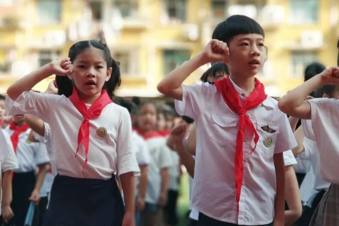 仰望国旗,我们神圣而庄重,全校少先队员在飘扬的五星红旗下,齐唱《中国少年先锋队队歌》:今天,我们是共产主义接班人;明天,我们是社会主义建设者。