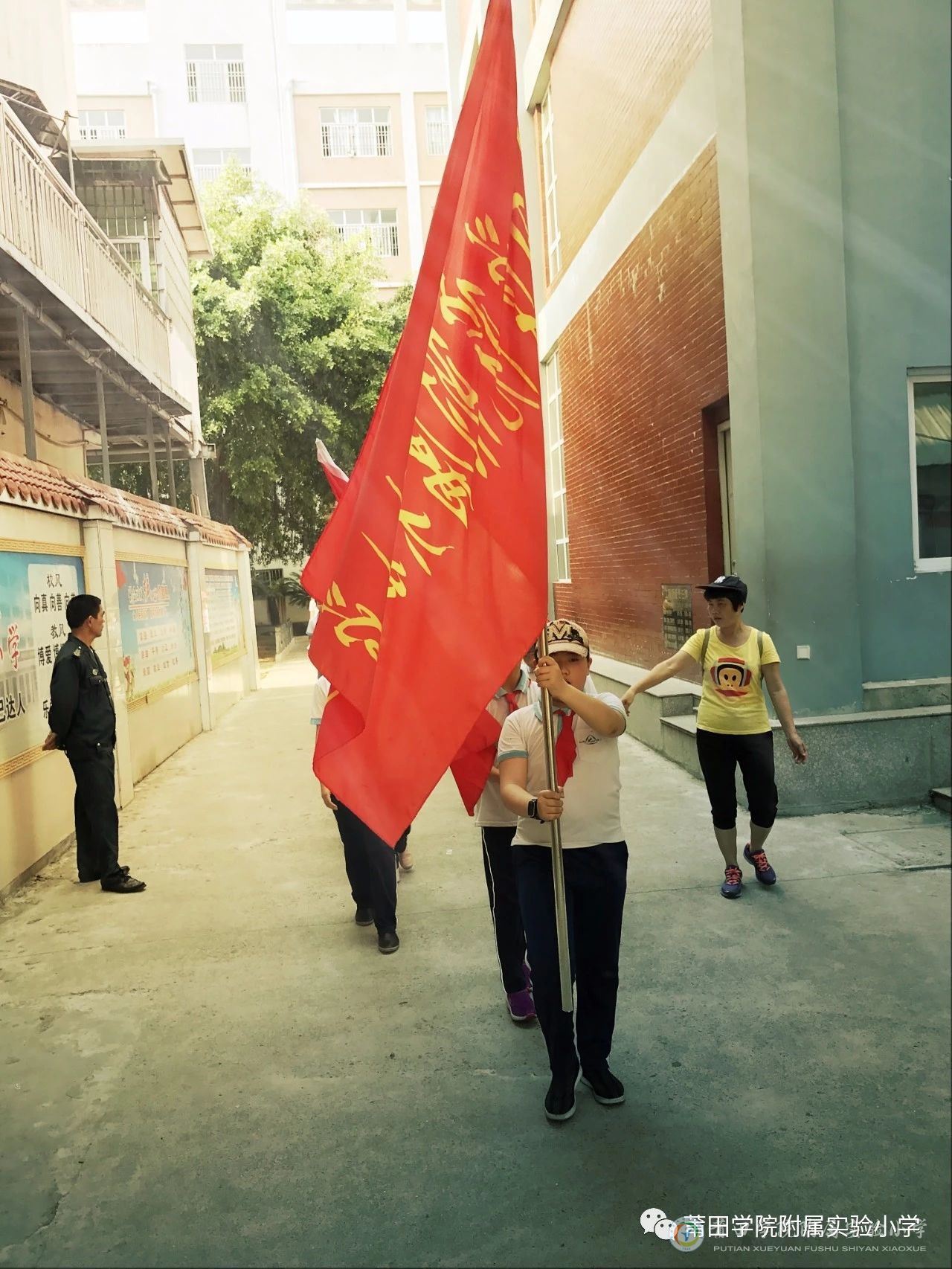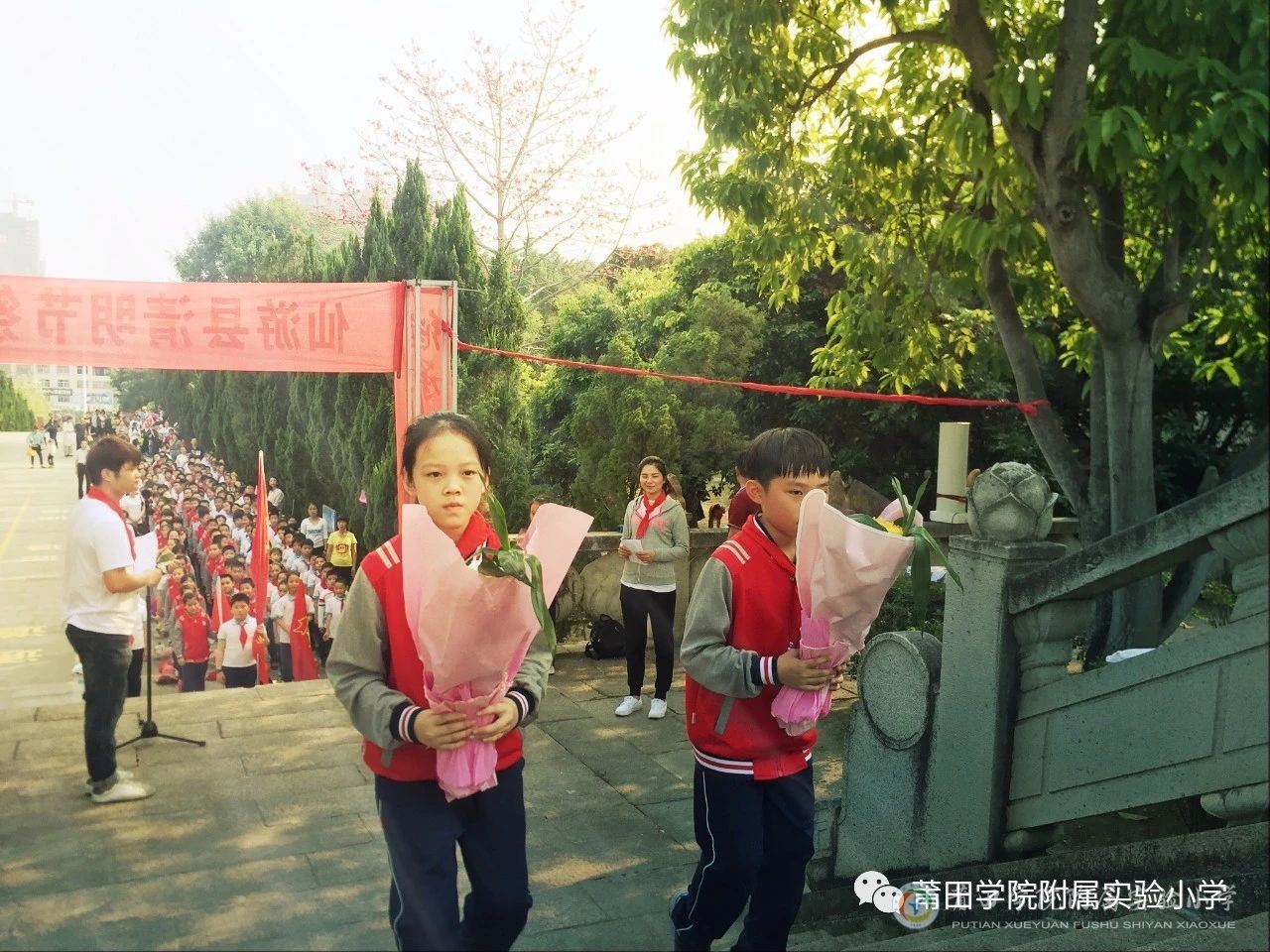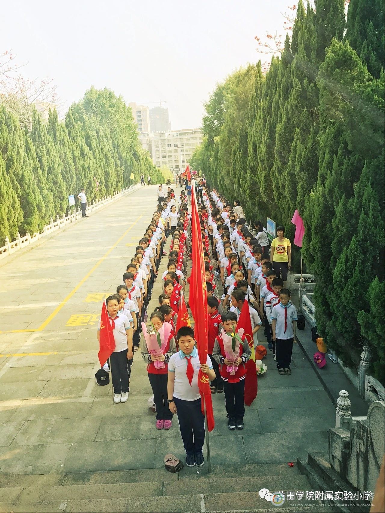 下午两点半,我校四年级全体学生穿戴整齐,佩戴红领巾,排着整齐的队伍从学校出发。