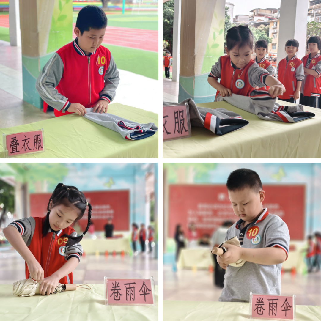 开幕后,劳动技能接力赛率先登场。一年级的小朋友们专注地卷雨伞、拧毛巾、叠衣服,动作虽稚嫩却认真十足;二年级的同学们戴红领巾、系鞋带、叠被子一气呵成,展现出良好的生活技能素养。