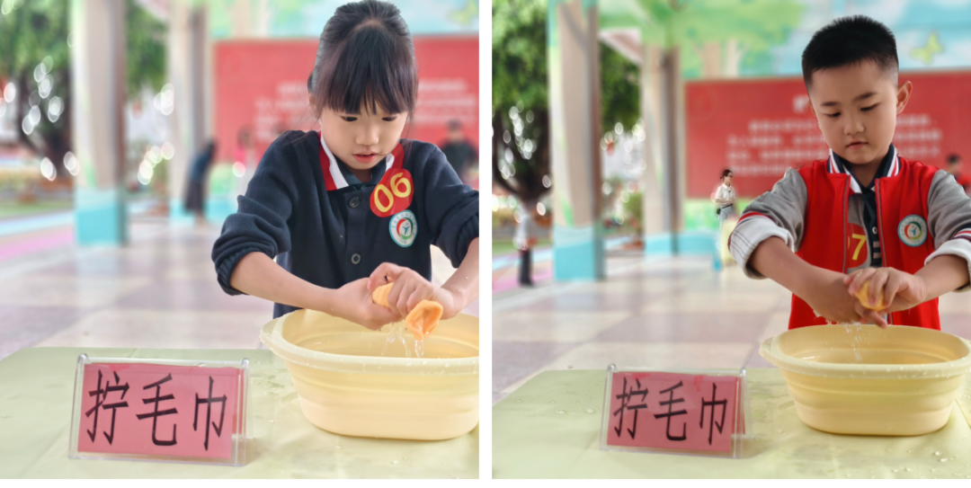 一年级小朋友参加“叠衣服”“卷雨伞”“拧毛巾”三项劳动技能接力。