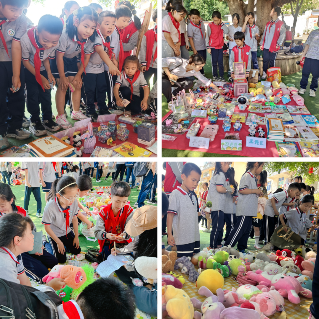 五年级跳蚤市场热闹“开市”,每个摊位上都摆满了精心挑选的宝贝。