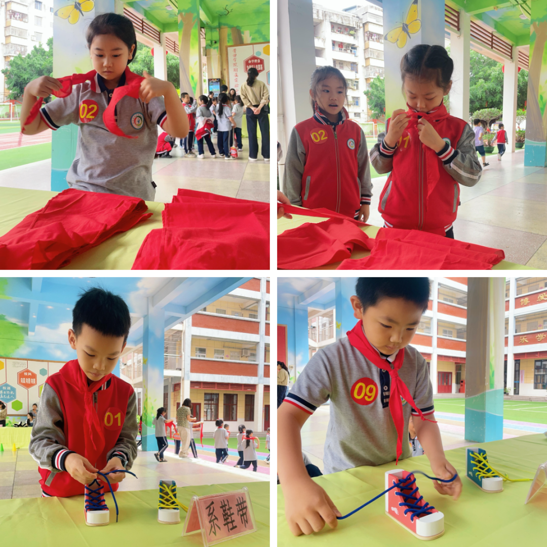 二年级小朋友参加“戴红领巾”“系鞋带”“叠被子”三项劳动技能接力。