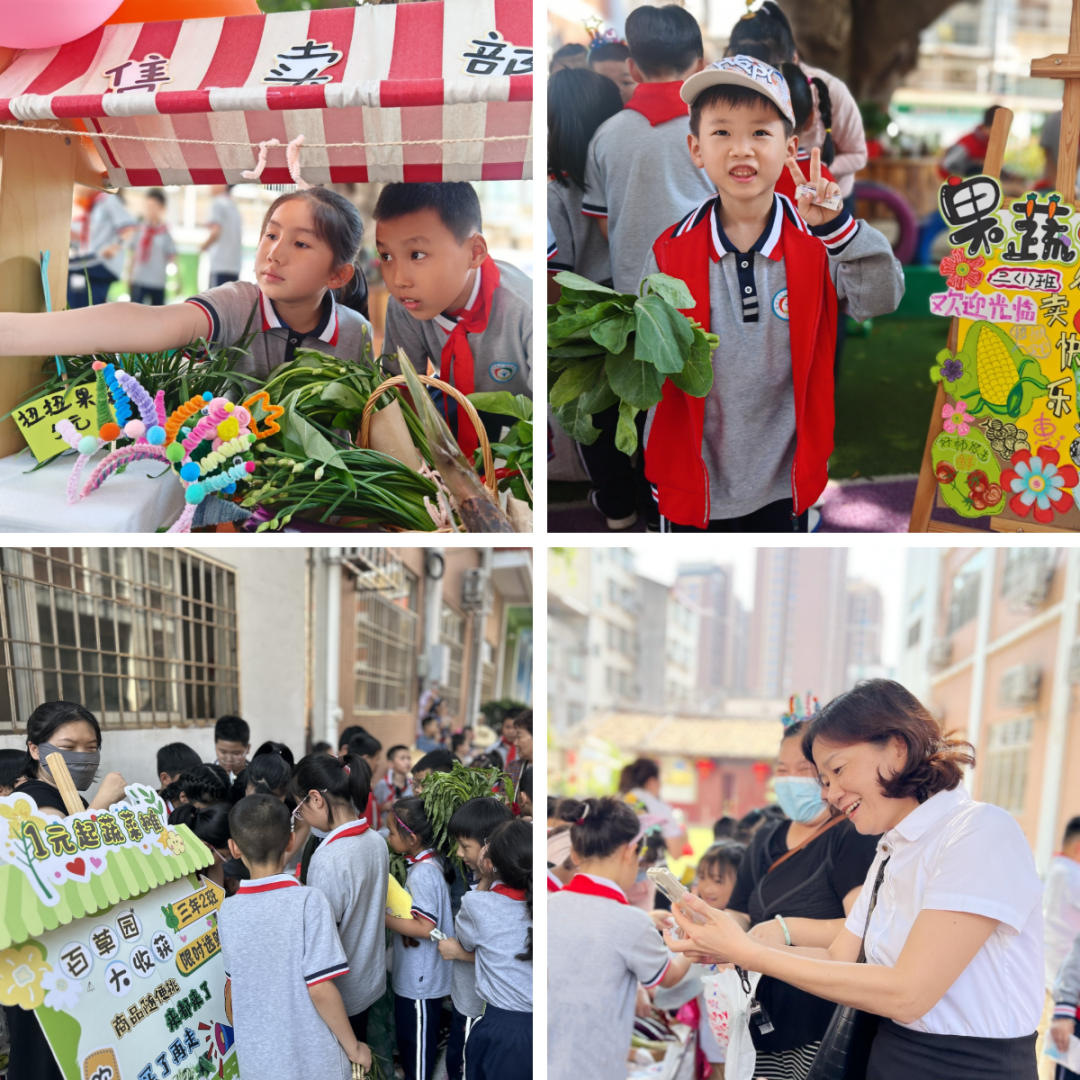 三年级萌娃化身为“小摊主”,在果蔬售卖摊位上热情吆喝。