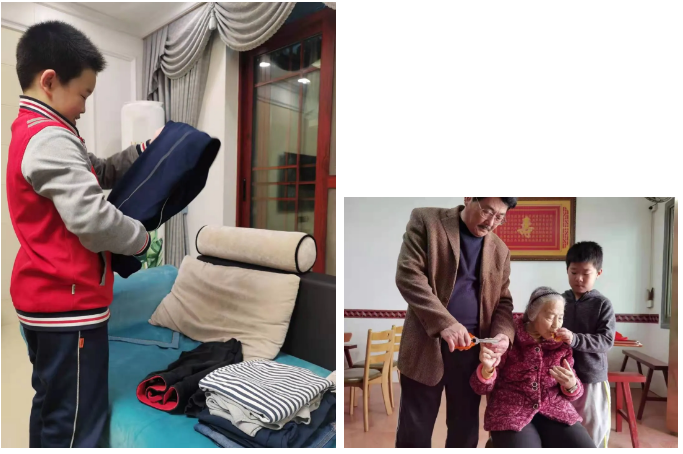 这一天,让孩子们来做一日家庭的顶梁柱吧!炒一盘菜,盛出满满的爱;煮一壶清茶,滋润你的心田……还有的同学帮妈妈洗车、叠被子、打扫卫生,帮奶奶洗菜、端菜……俨然一个家务小能手!
